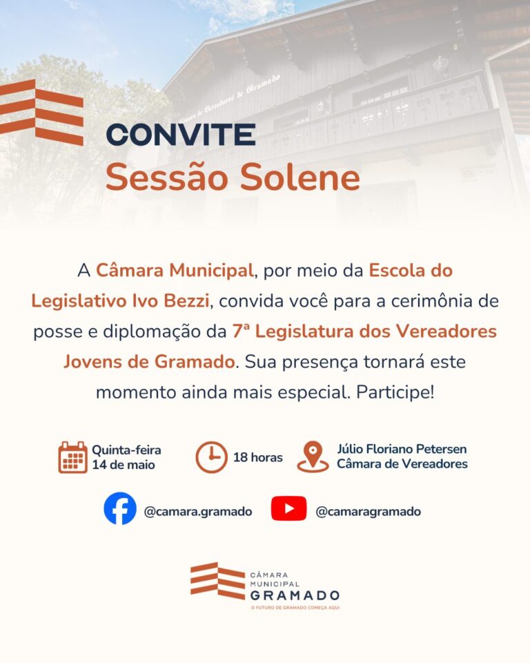Gramado Câmara de Gramado convida para posse da 7ª Legislatura dos Vereadores Jovens Leia mais Redação Mistura News 24/04/2026