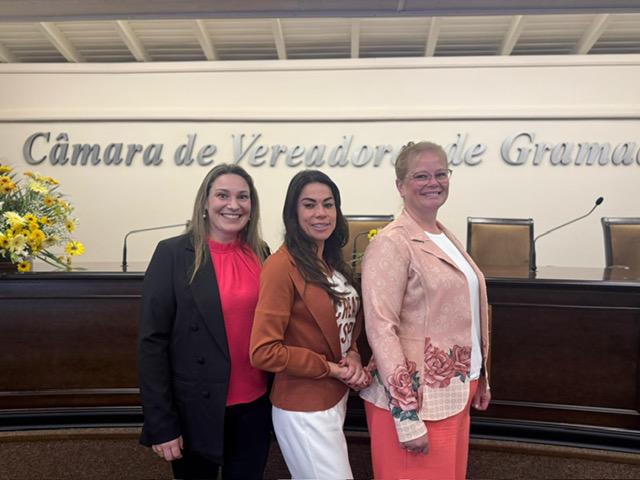 Na manhã desta quinta-feira, dia 2, a Mesa Diretora da Câmara de Vereadores de Gramado realizou uma reunião aberta para o ato simbólico de posse das vereadoras suplentes que assumiram suas cadeiras. Passam a compor a Casa Legislativa as vereadoras Profª. Denise, Vivi Cardoso e Fernanda Pereira Dias, todas do partido Progressistas.